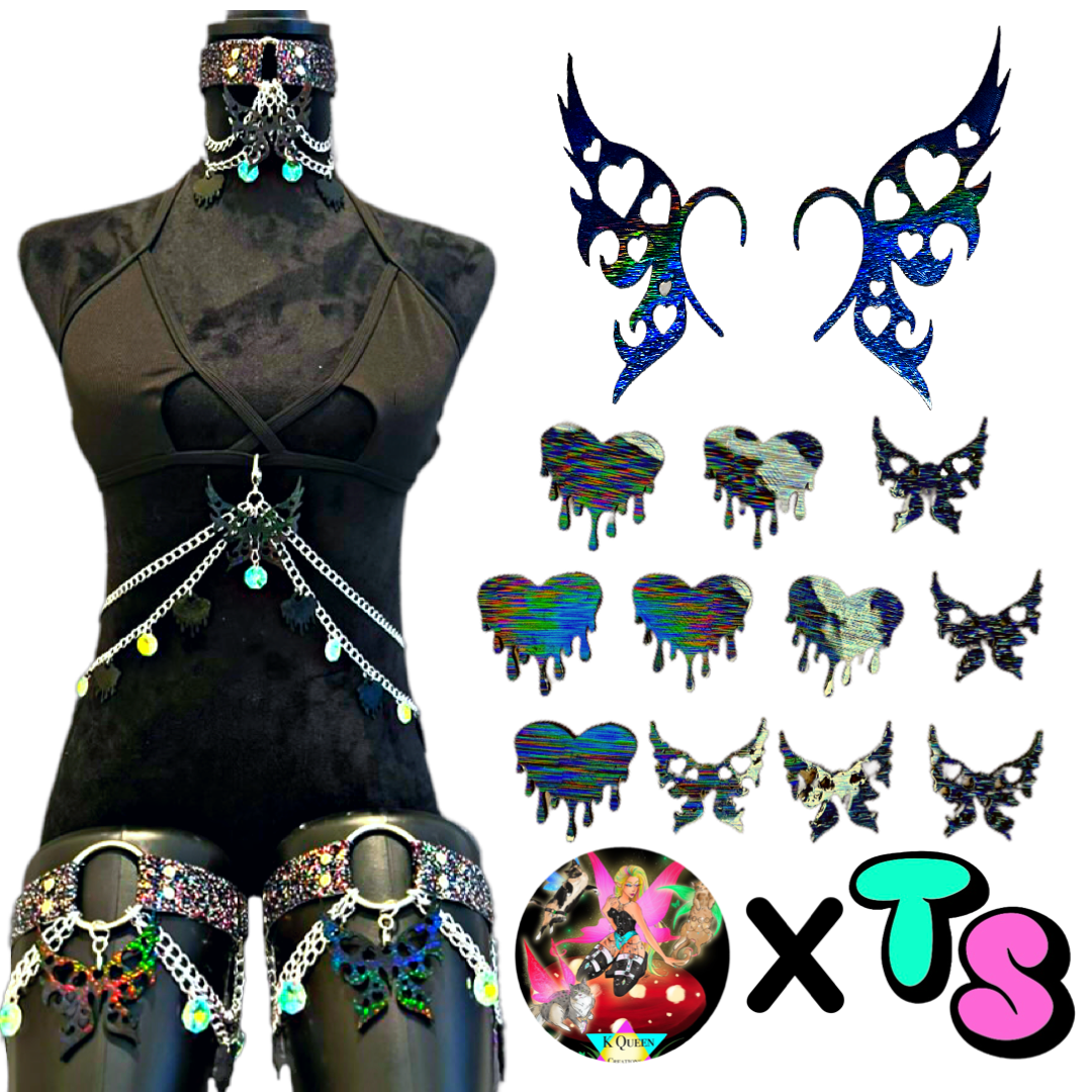 What’s included: a body chain, choker, and garters with glitter straps tailored to your size and embellished with custom 3D-printed pendants, Custom Butterfly Ear Cuffs and 10 Kandi beads made specifically to match this fit.